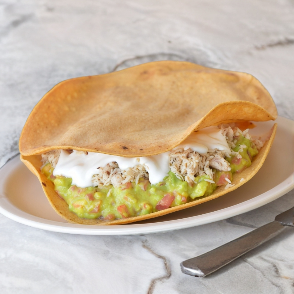 Tostada gigante con una cama de guacamole de la casa, pechuga de pollo y crema.