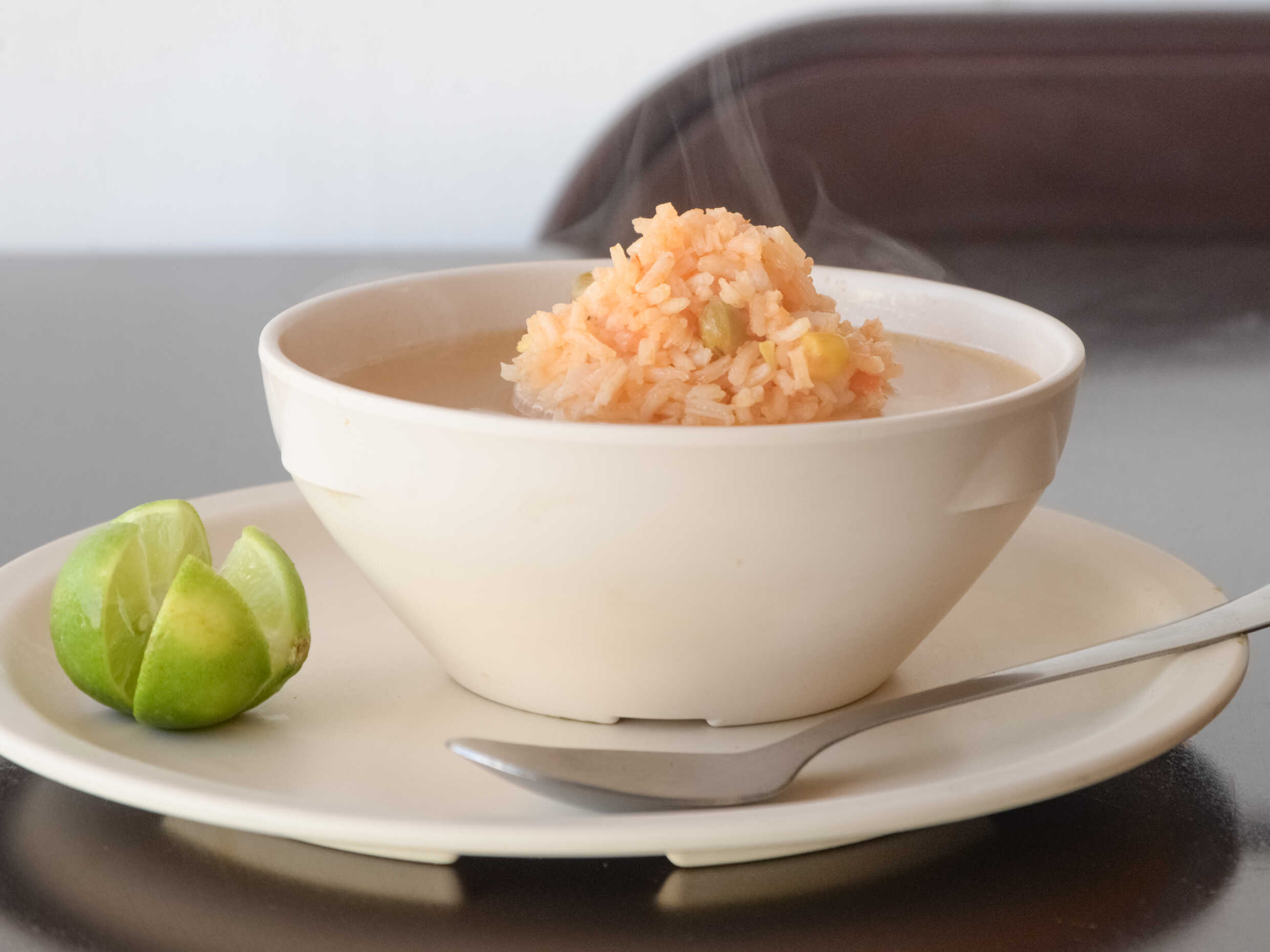 Riquísimo caldo, arroz con verduras y pierna jugosa de pollo.