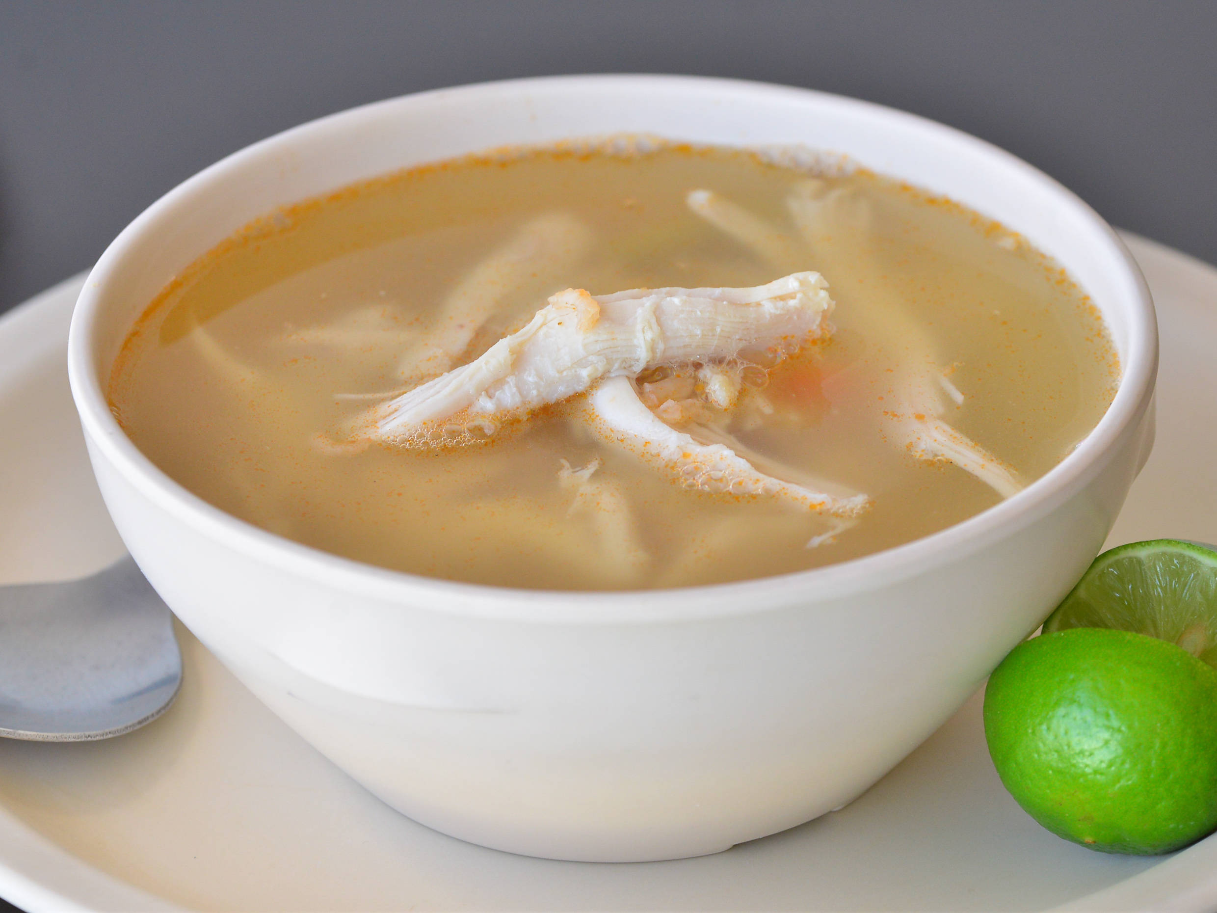 Riquísimo caldo, arroz con verduras y pechuga de pollo.