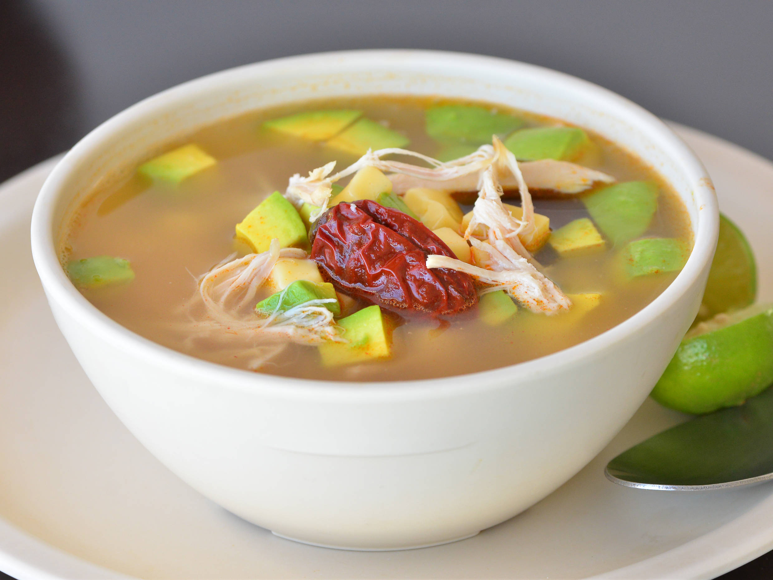 Riquísimo caldo, arroz con verduras, aguacate, queso, chile chipotle y pechuga de pollo. Simplemente el mejor.