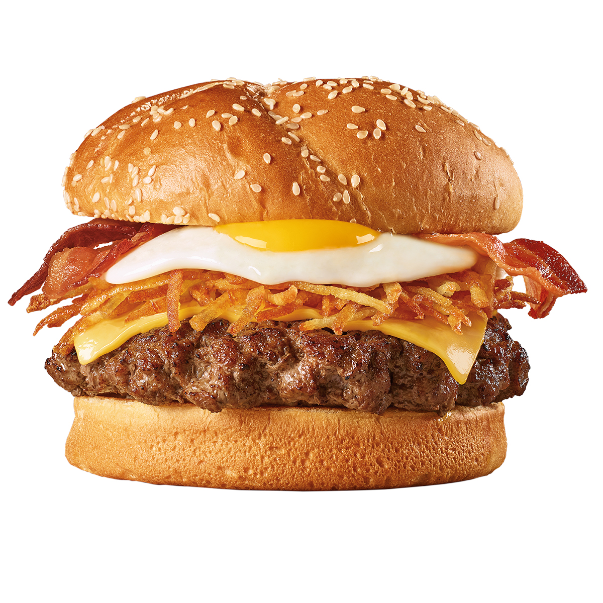 Hamburguesa con carne de res, papas fritas, huevo estrellado, tocino y queso americano en pan brioche.