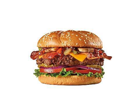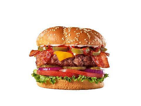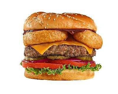 Hamburguesa con carne de res cubierta de queso cheddar, 3 aros de cebolla a la cerveza, salsa bbq, lechuga, tomate, cebollas rojas y pepinillos.