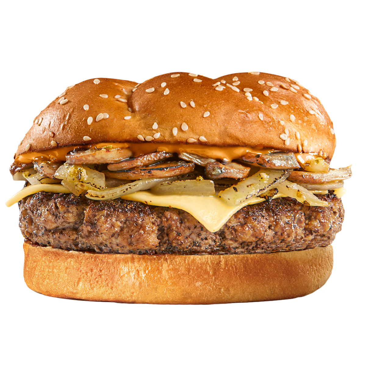 Hamburguesa con carne de res, champiñones al ajillo, cebollas caramelizadas, queso suizo y salsa all american en pan brioche.