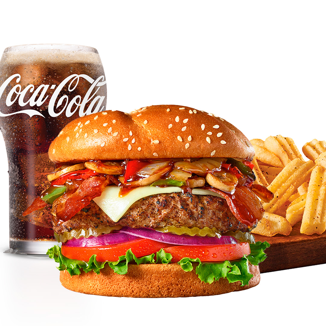 Queso cheddar, tocino, champiñones salteados, cebollas y pimientos asados al fuego, salsa bourbon, lechuga, tomate, cebollas rojas y pepinillos.