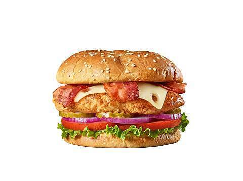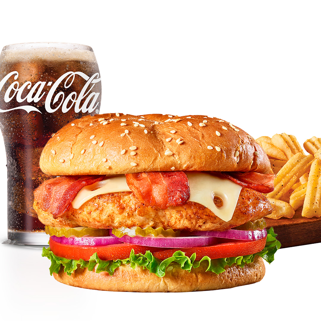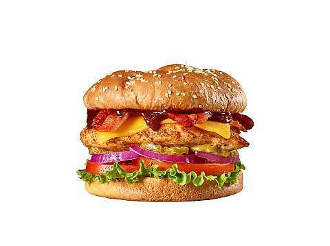 Hamburguesa con pechuga de pollo sazonada a la parrilla, queso cheddar, tocino, salsa bbq, lechuga, tomate, cebollas rojas y pepinillos.