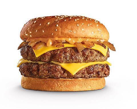 Hamburguesa con doble carne de res, cubiertas en queso americano, cebollas caramelizadas y salsa de la casa.