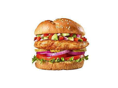 Hamburguesa con pechuga de pollo sazonada a la parrilla, aguacate, pico de gallo, lechuga, tomate, cebollas rojas y pepinillos.