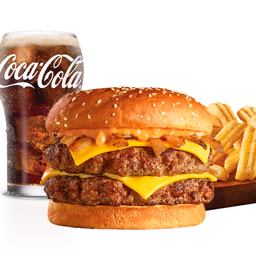 Dos carnes 100% de res cubiertas con queso americano, cebollas caramelizadas y salsa, papas onduladas y tu selección de refresco coca cola.