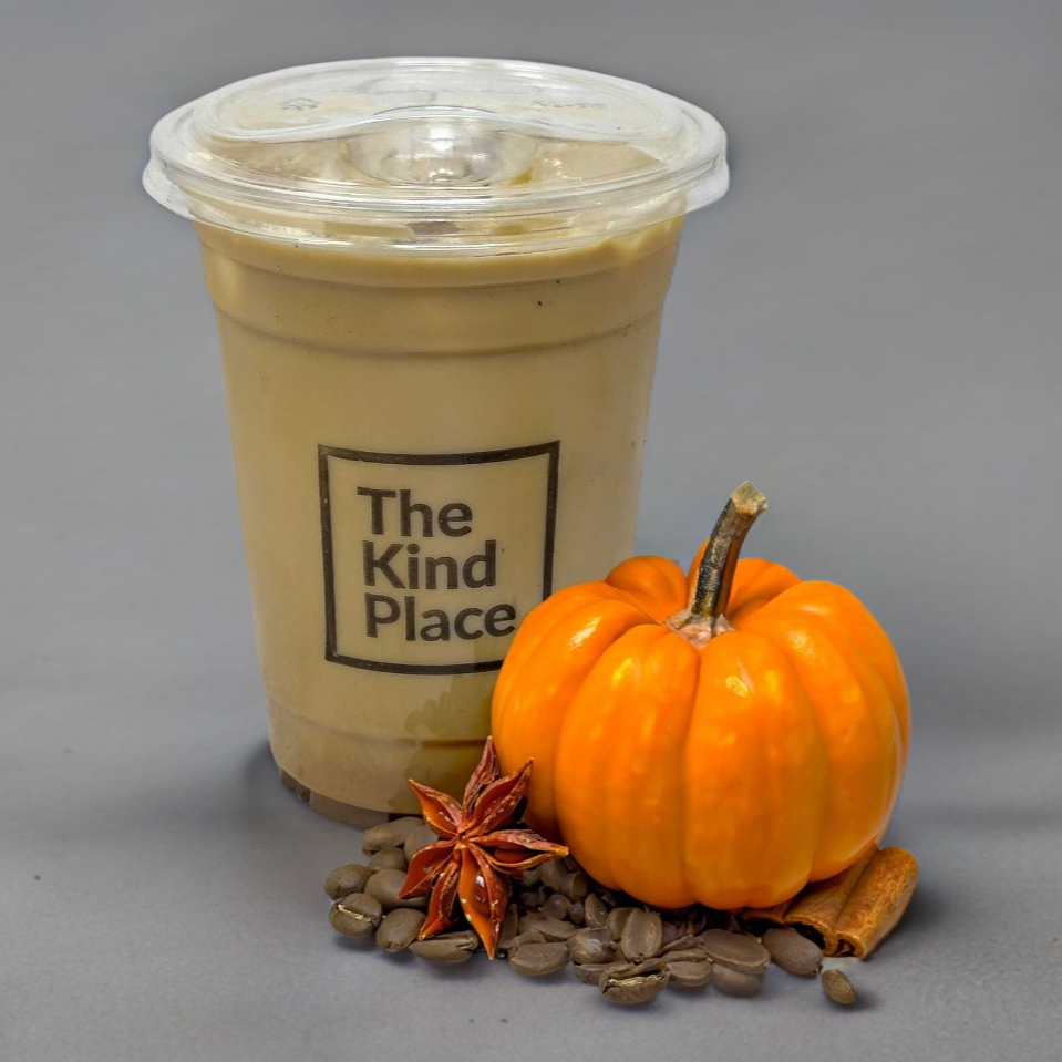Espresso recién extraído mezclado con leche, hielo y esencia de calabaza y especias.