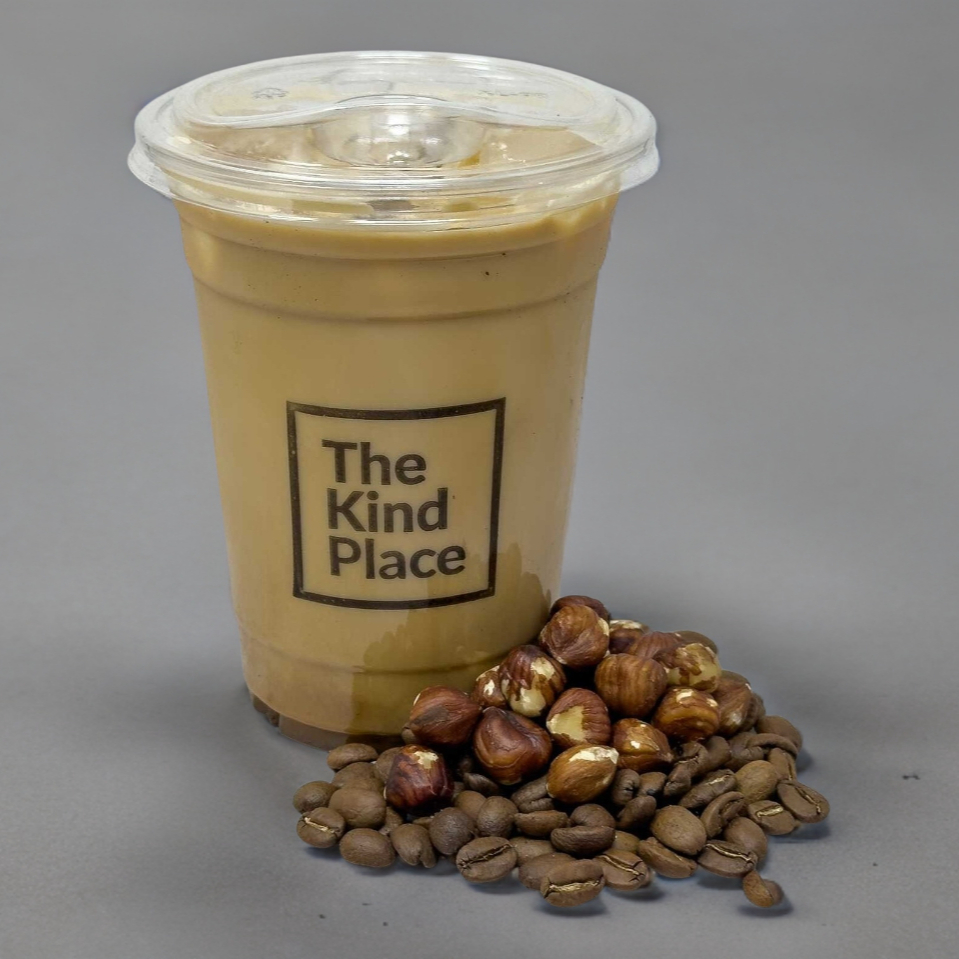 Espresso recién extraído mezclado con leche, hielo y esencia de avellana.
