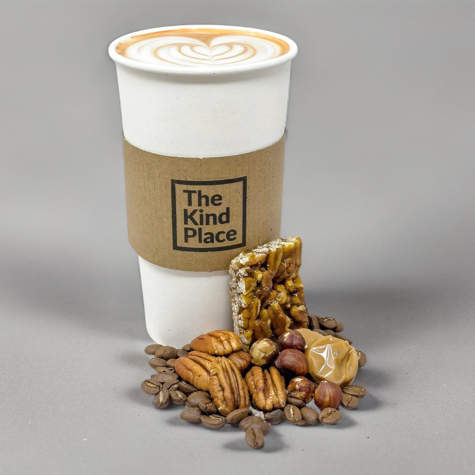 Espresso recién extraído mezclado con leche espumada con esencia de Toffee Nut. (Caramelo de Nuez)