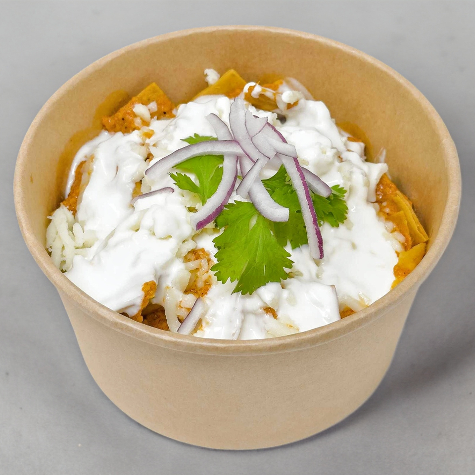 Totopos hechos a mano (sí, de verdad), bañados en salsa bien sabrosa, con su buena porción de queso, crema, su cebollita y su cilantro. Puedes agregar pollito o chicharrón prensado pa' que amarre. Todo servido en un bowl listo para llevar o comer donde quieras. Crujientes, cremosos, picositos. Con todo el flow.