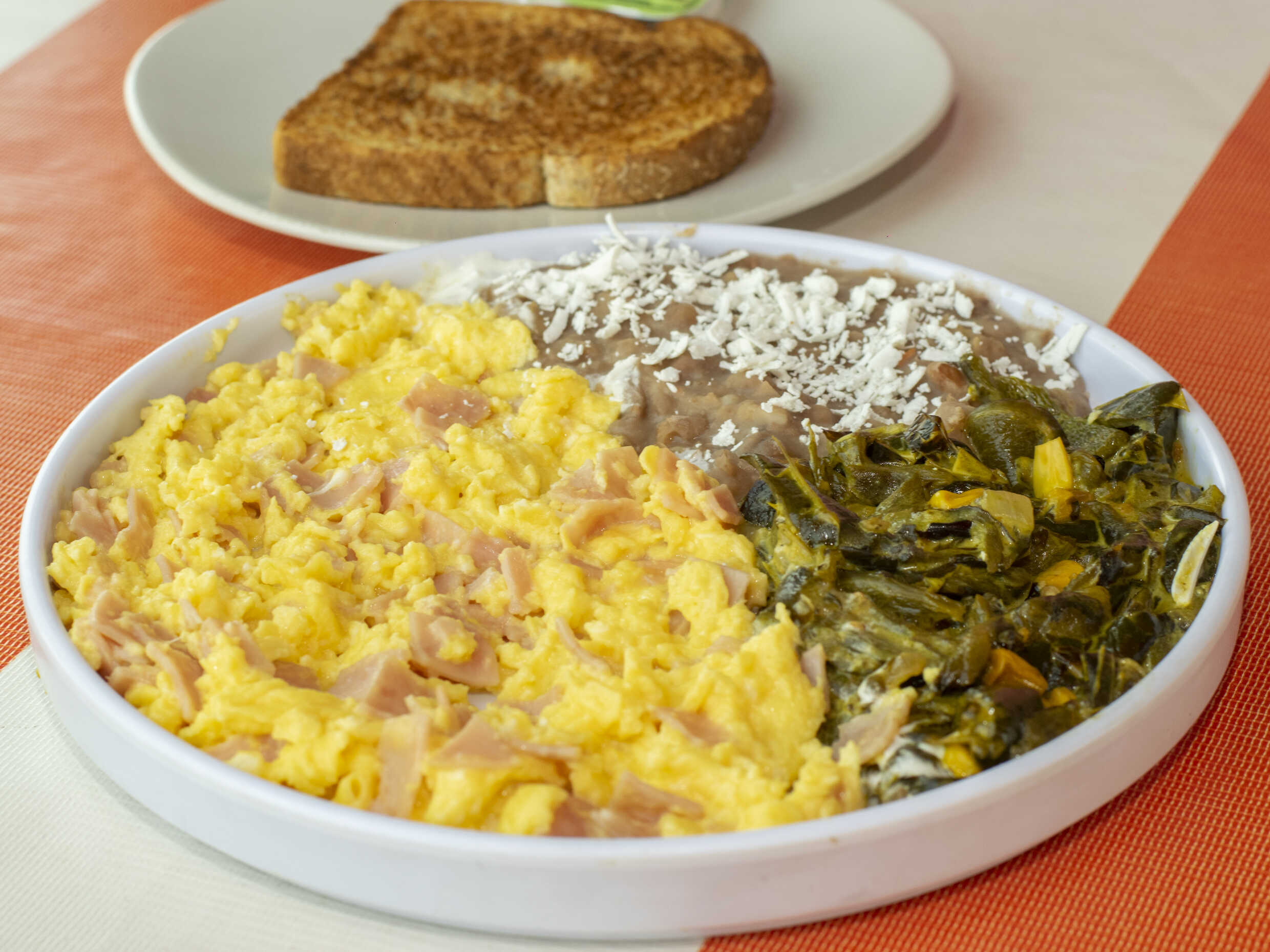 2 Huevos, frijoles, 1 guiso y 2 rebanadas de tocino frito.