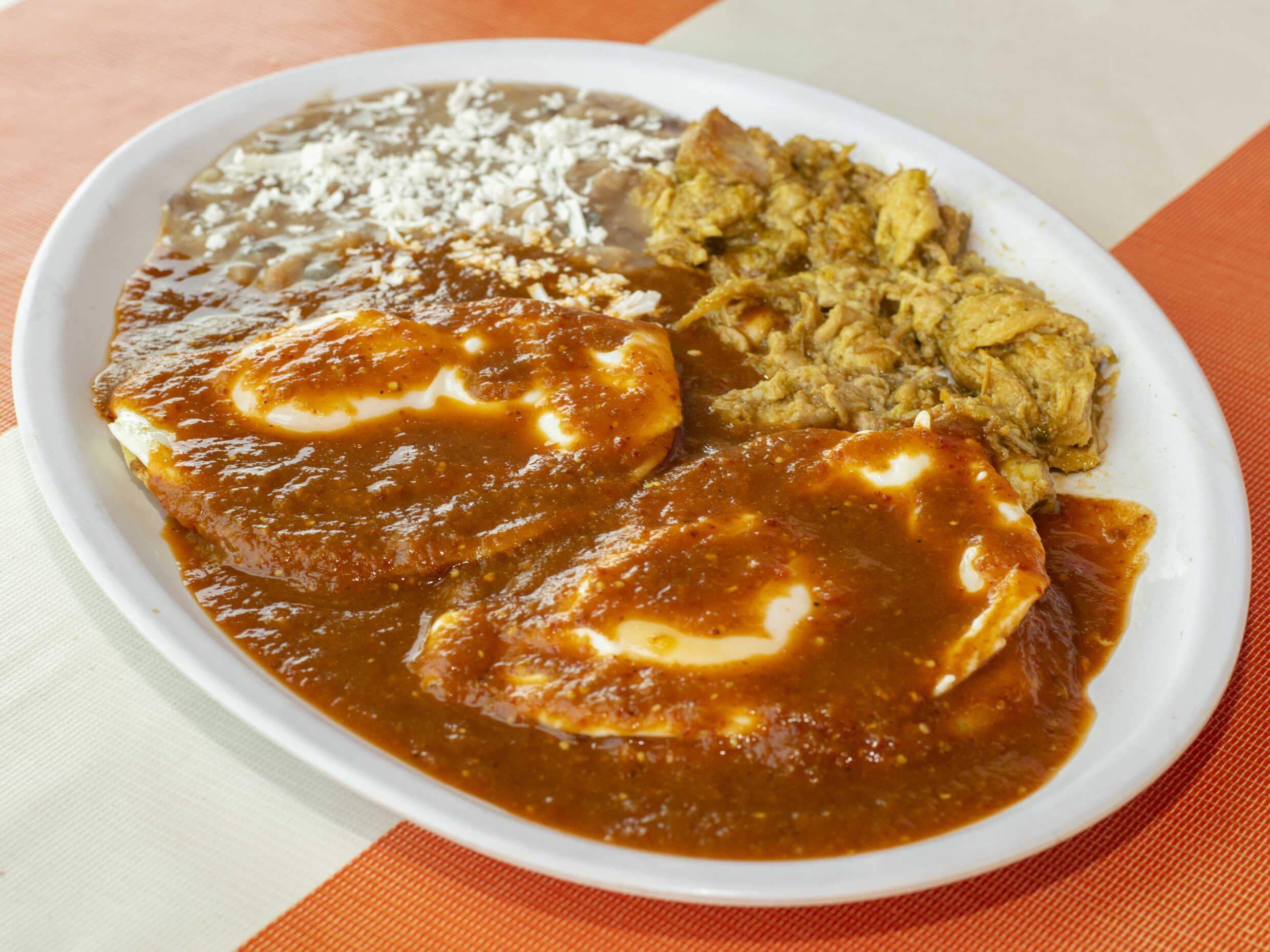 2 Huevos estrellados y montados en 2 tortillas bañadas en salsa roja de la casa, frijoles y guiso.