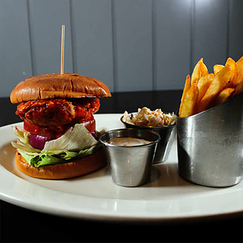 Pechuga de pollo empanizada (150gr) y bañada en salsa buffalo, tomate, lechuga, cebolla morada y aderezo blue cheese. Papas fritas y ensalada col
