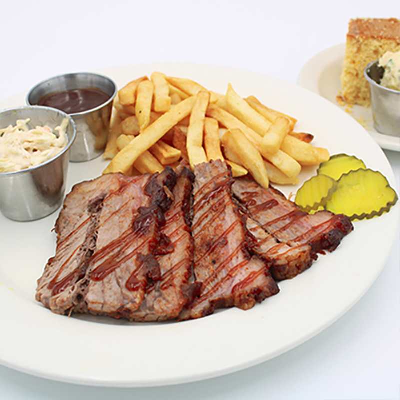 Jugosas rebanadas de beef brisket ahumado ( 250 grms) , horneada a fuego lento, condimentada con una mezcla de 10 especies diferentes y bañada en nuestra Salsa BBQ original, servidas con ensalada de col, papas a la francesa, pepinillos y una pieza de pan de maíz