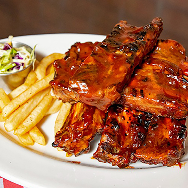 Costillas Baby Back de 9 a 10 huesos , bañadas en salsa original BBQ, acompañadas con guarniciones de ensalada col y papas fritas
