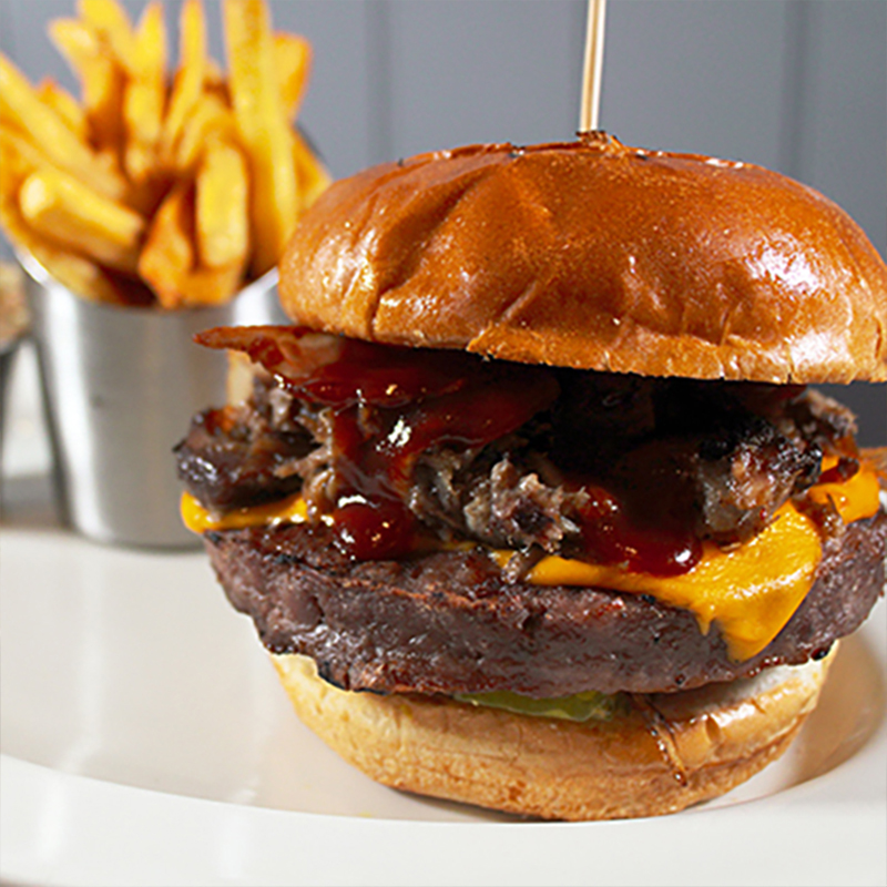 Una hamburguesa con carne de res de primera calidad ( 220 grms ) , rebanadas beef brisket ahumado horneado , bañadas en un fondue de queso con salsa bbq, acompañadas de una mermelada de jalapeño, pepinillos, lechuga, cebolla y tomate, con guarnición de papas a la francesa y ensalada de col