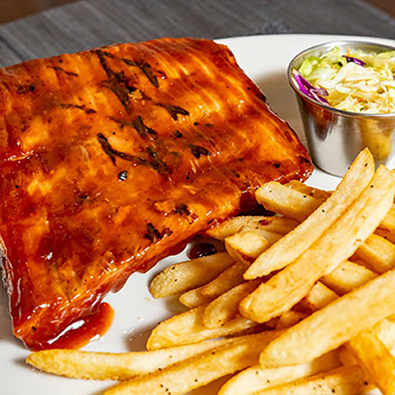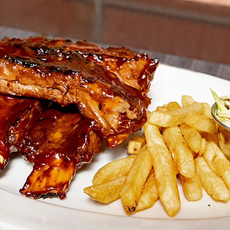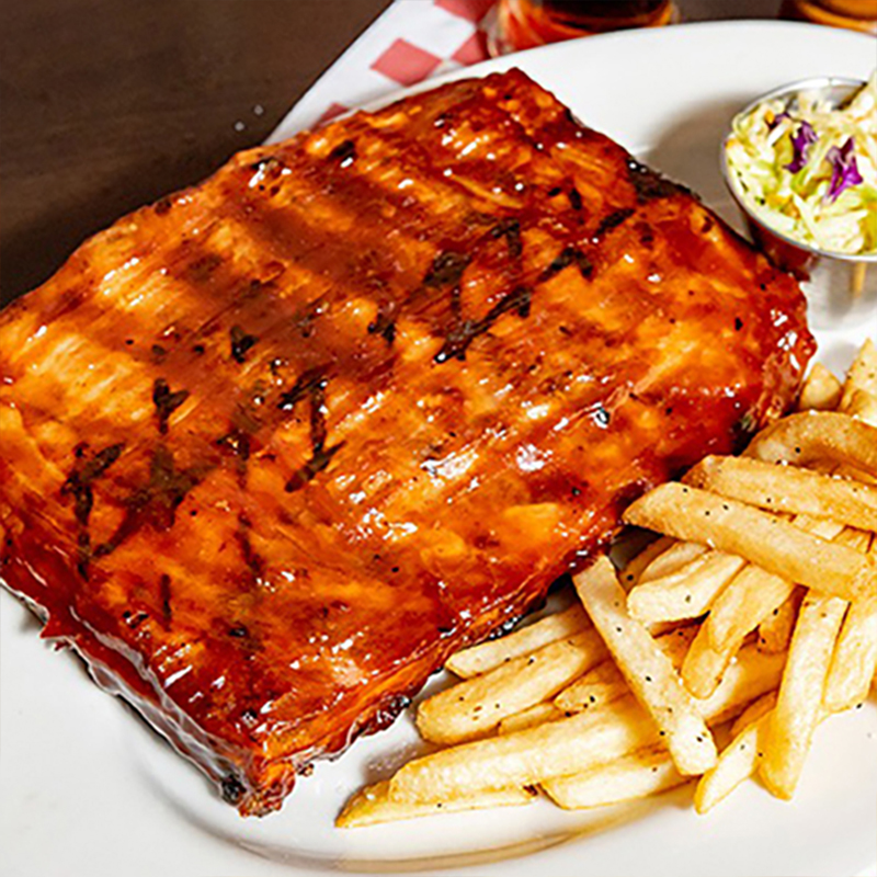 Costillas Baby backs de 4 a 5 huesos , bañados en salsa original BBQ, acompañadas de ensalada col y papas fritas