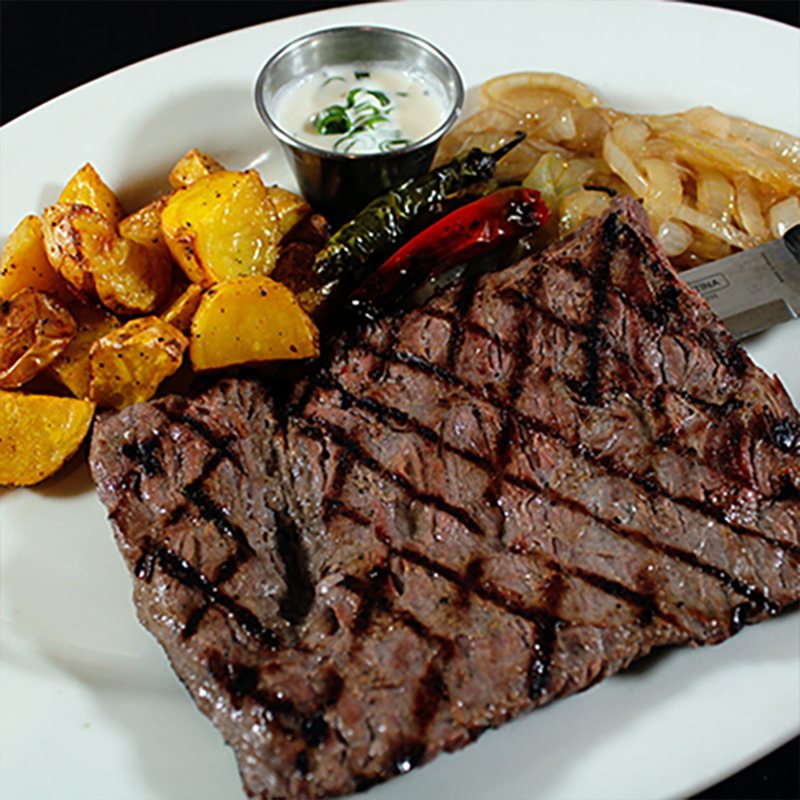 Arrachera premium (350gr), salsa de mantequilla de tocino y cebollin, papa asada
