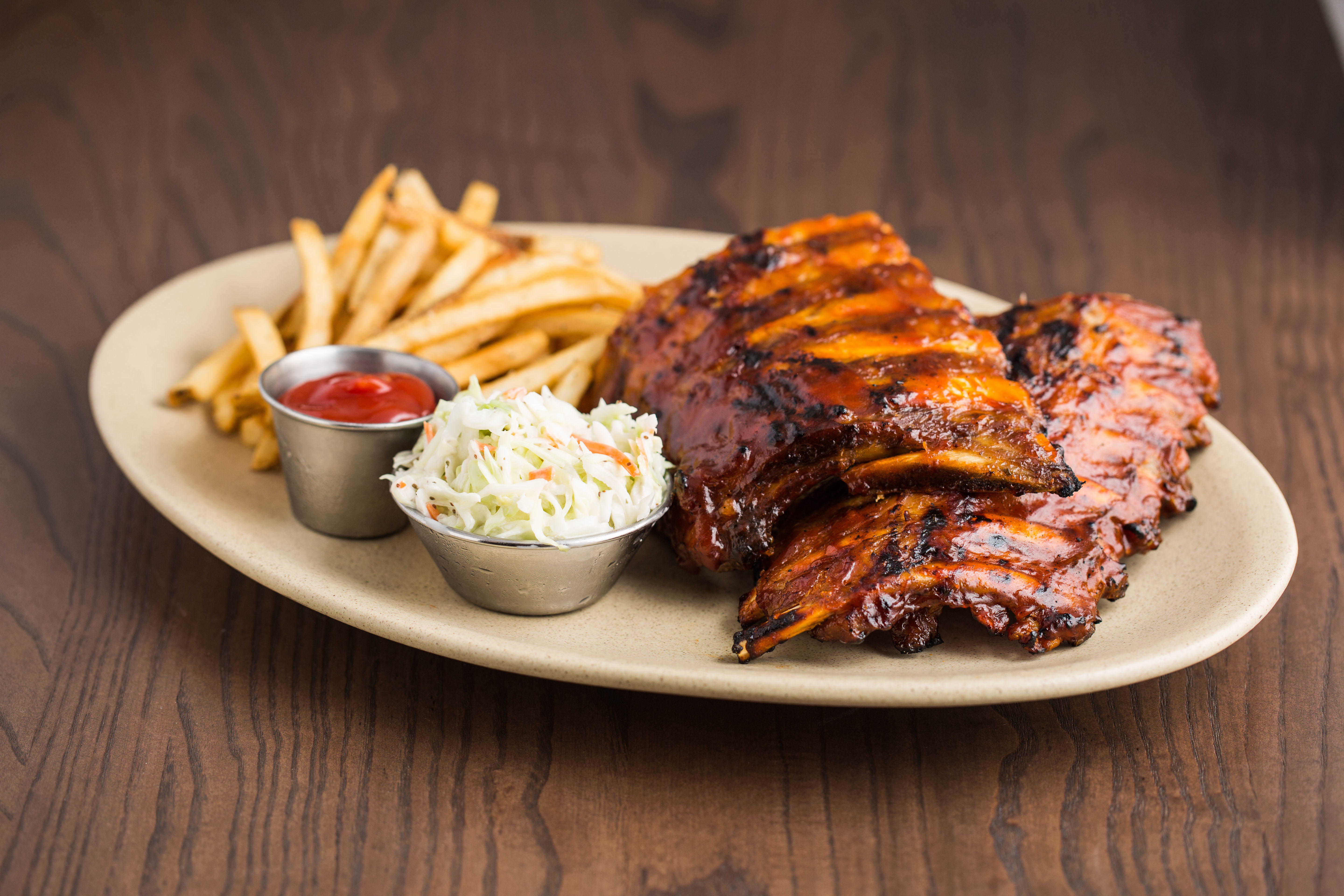 Costilla estilo St. Louis, salsa Original BBQ, papas fritas y ensalada col