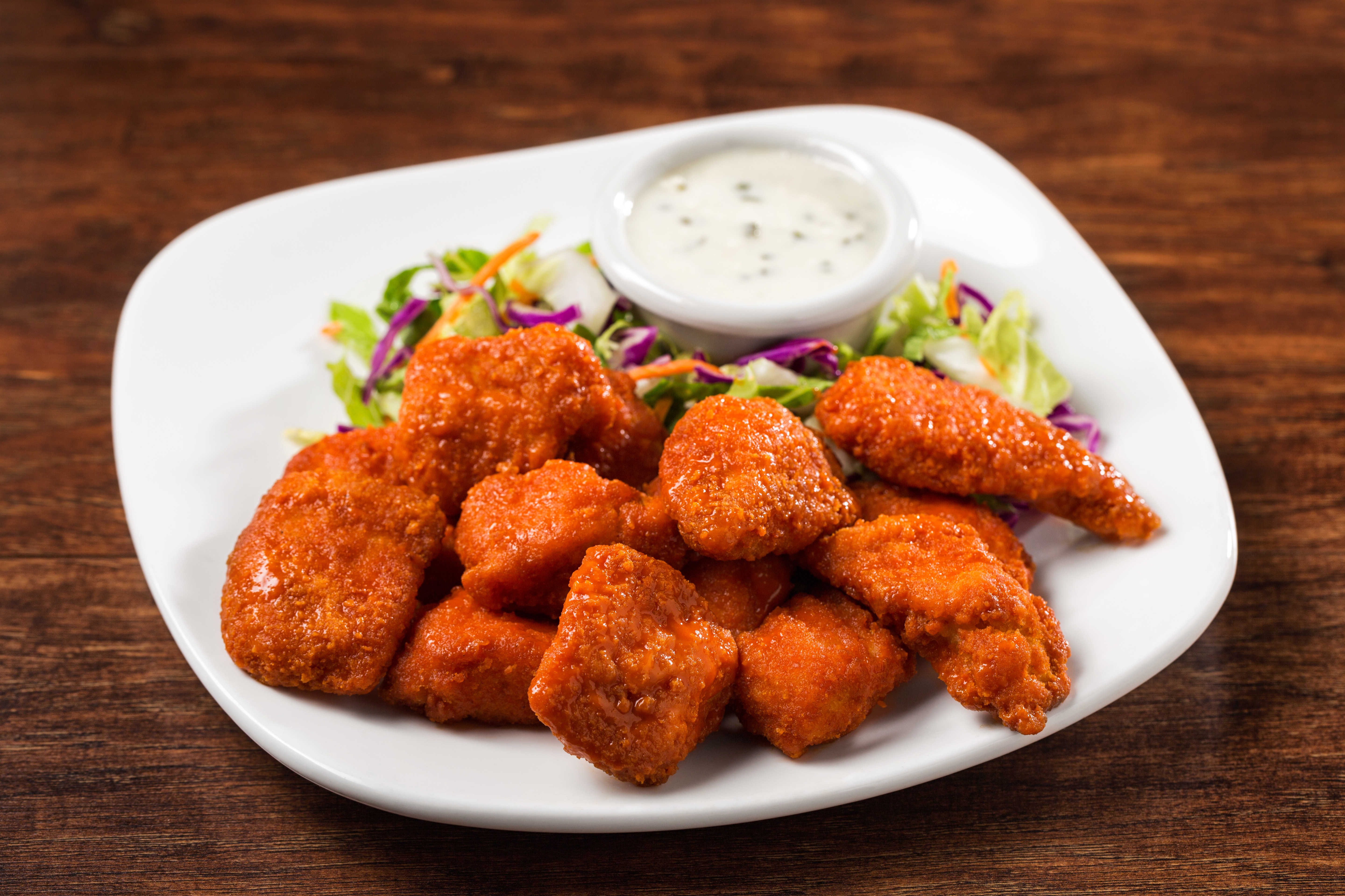 Trozos de pechuga de pollo empanizados (284 gr), salsa búfalo y aderezo blue cheese