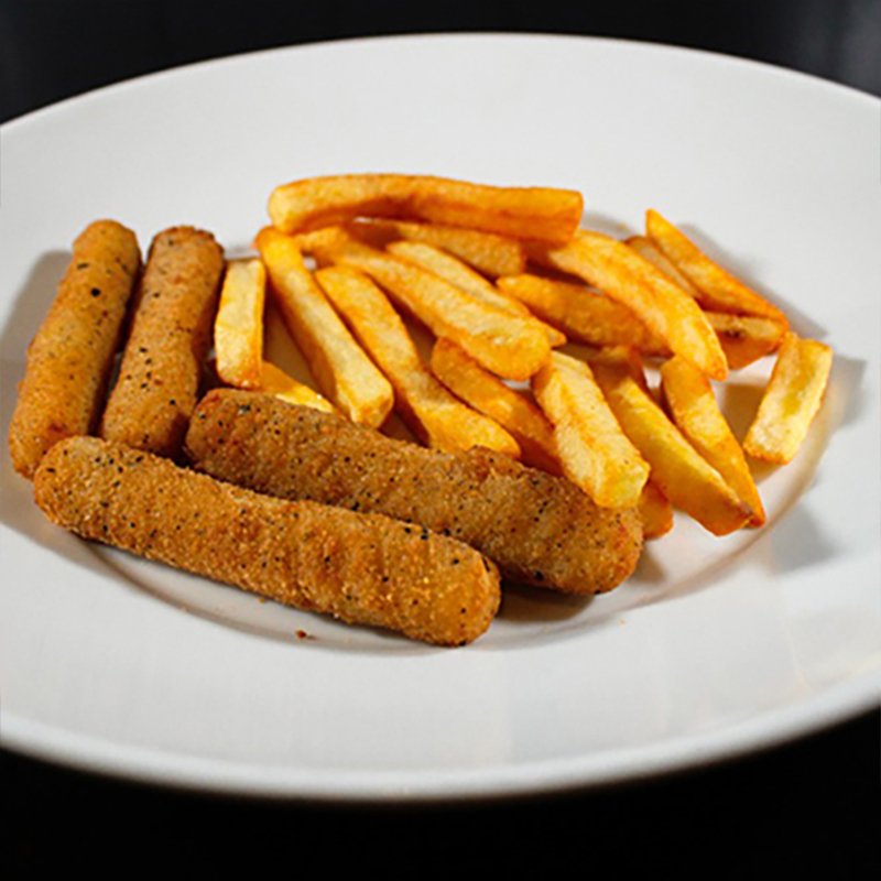 Palitos de queso mozzarella empanizados, acompañados con salsa marinara. Servida con papas fritas.