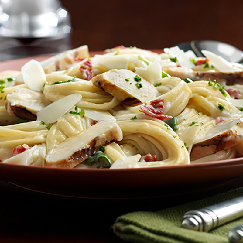 Pasta linguini con pollo a la parrilla (150 gr) en salsa Alfredo