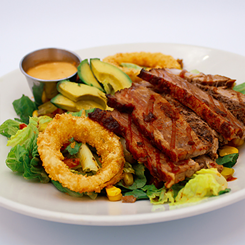 Lechuga romana, queso cheddar, tomates asados, pepino y elote, cubiertos con rebanadas de beef brisket ahumado y bañada en salsa bbq original, con aros de cebolla empanizados y cuadros de aguacate , servidos con nuestro nuevo aderezo onion ranch dressing