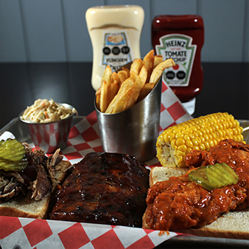 Un ¼ de nuestras costillas mundialmente famosas con salsa Original BBQ. Elije un ítem de pollo y de cerdo. Servido con medio elote, ensalada de col y papas fritas.