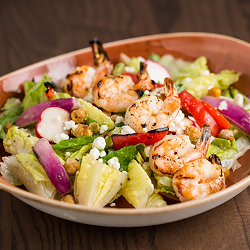 Camarones (6pz) a la parrilla, servidos sobre lechuga romana, tomates asados, palmitos, garbanzos crujientes, cebolla y pimientos asados, queso de cabra desmenuzado, vinagreta de limón con trufa