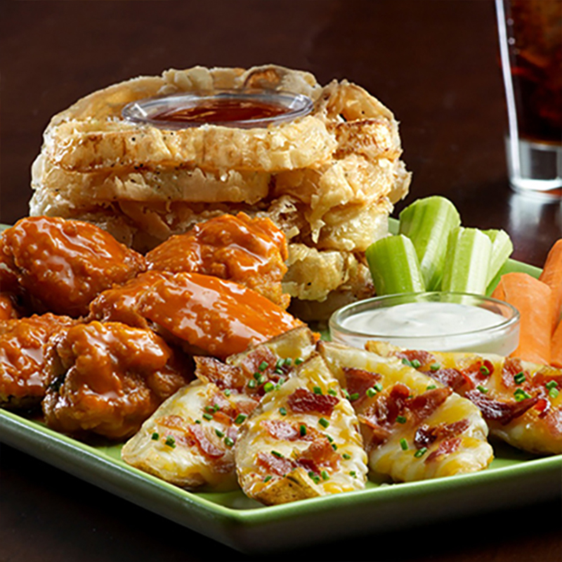 Un trío de nuestras mejores entradas – Boneless Chicken Wings (140gr), Potato Skins y Onion Loaf, aderezo Blue Cheese, crema agria y salsa Original BBQ