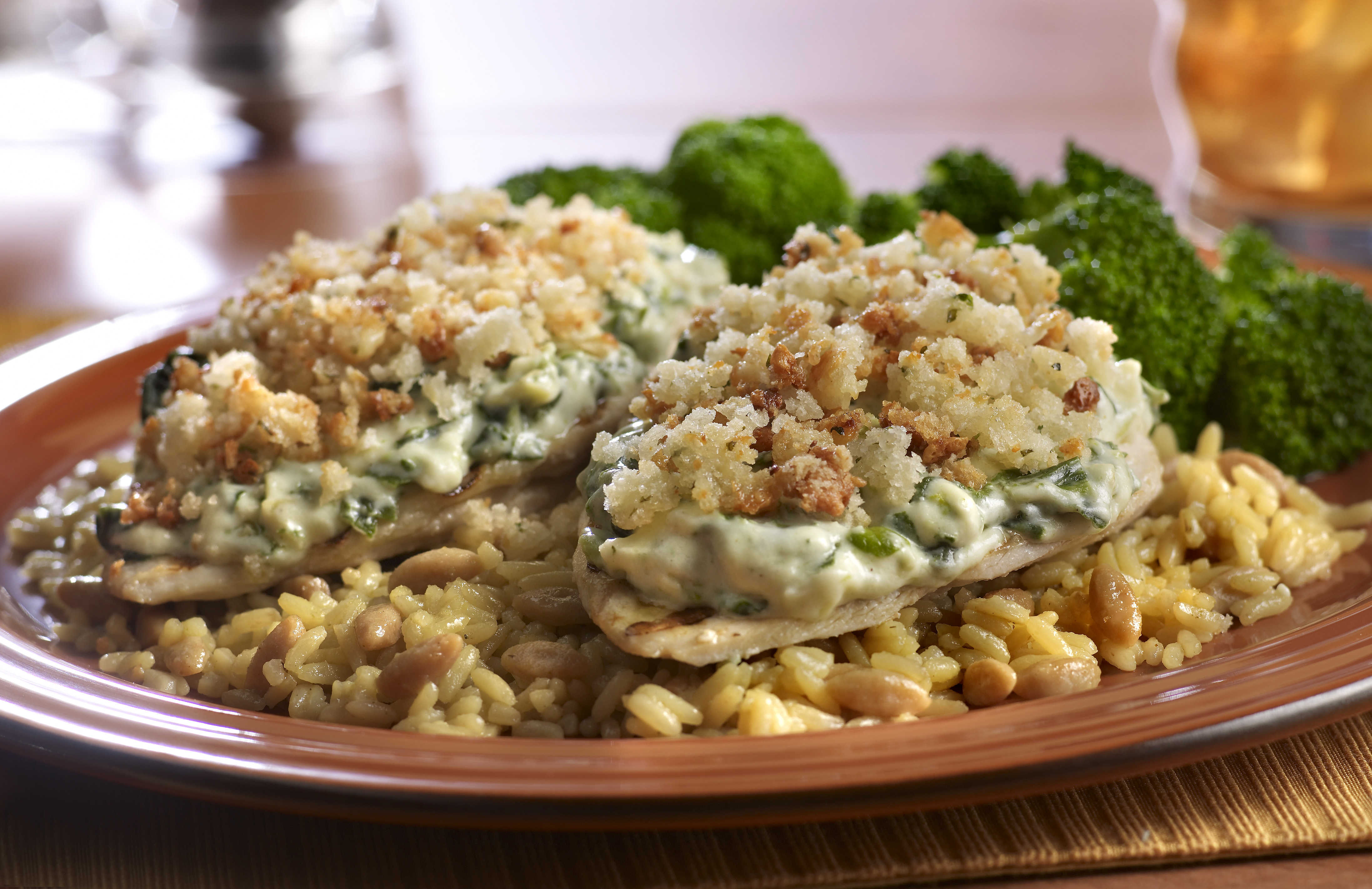 Pechuga de pollo (300 gr) a la parrilla cubierta con una mezcla de quesos italianos, corazones de alcachofa y espinacas, servida con arroz y ejotes salteados con ajo