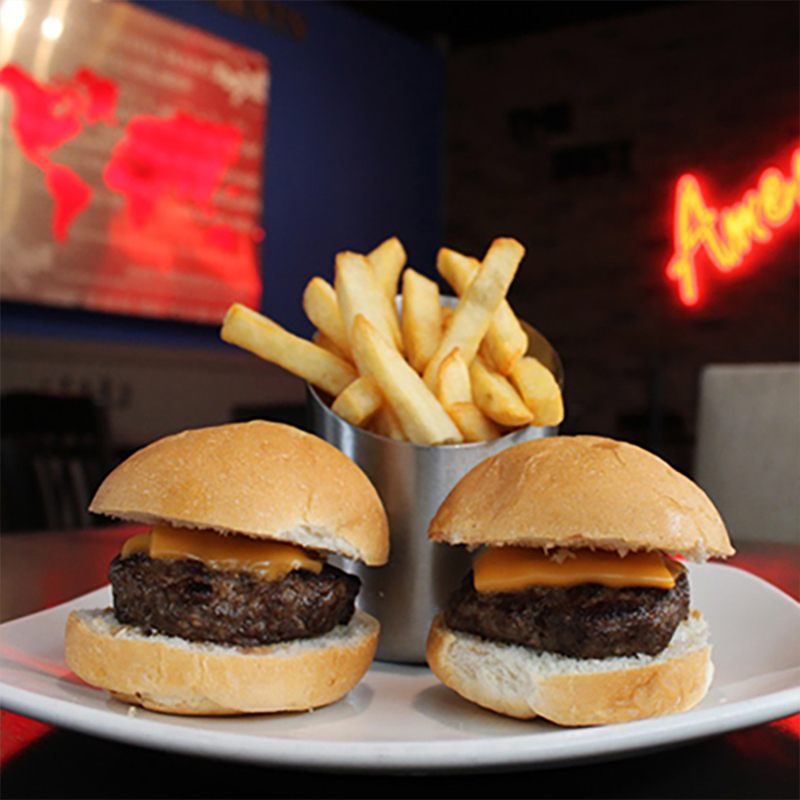 Carne molida de res, queso Cheddar. Servida con papas fritas