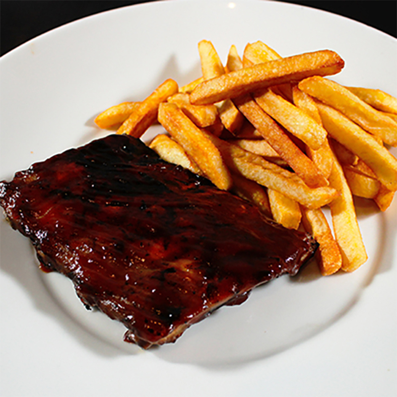 Costillitas salsa Original BBQ servidas con papas fritas.