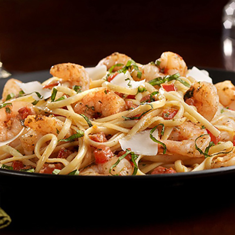 Camarones (170gr) salteados en salsa de mantequilla chipotle y ajo. Preparados con tomate asado y albahaca fresca; servida con pasta linguini espolvoreada con queso parmesano.