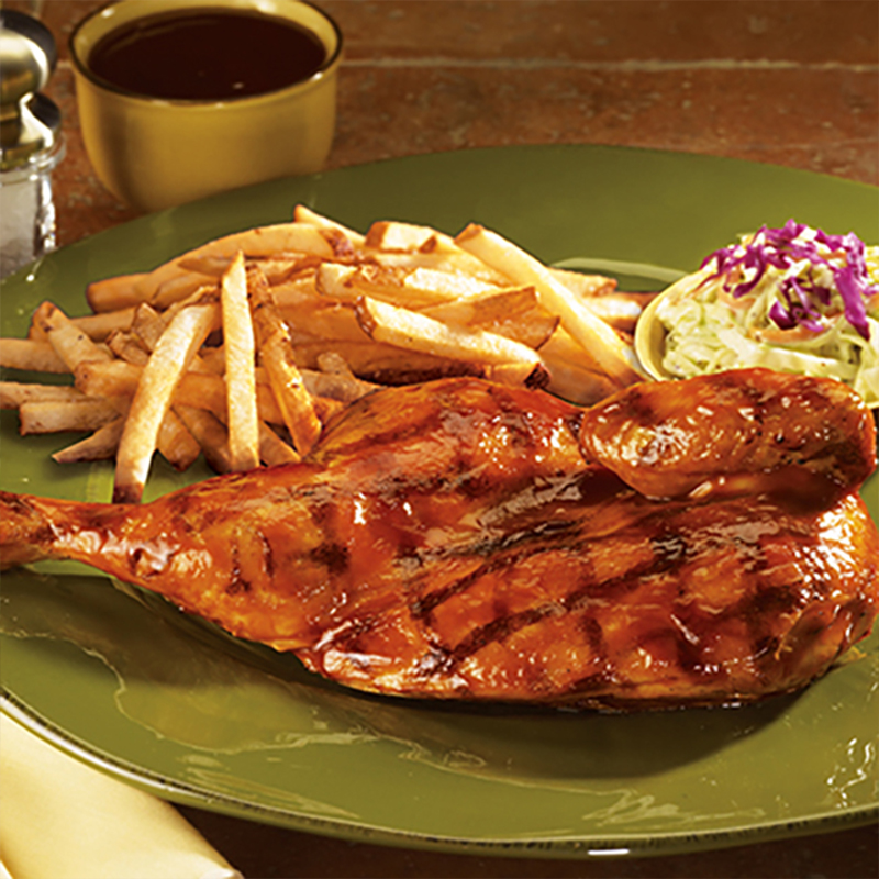 Medio pollo a la parrilla glaseado en salsa Original BBQ, papas fritas y ensalada col