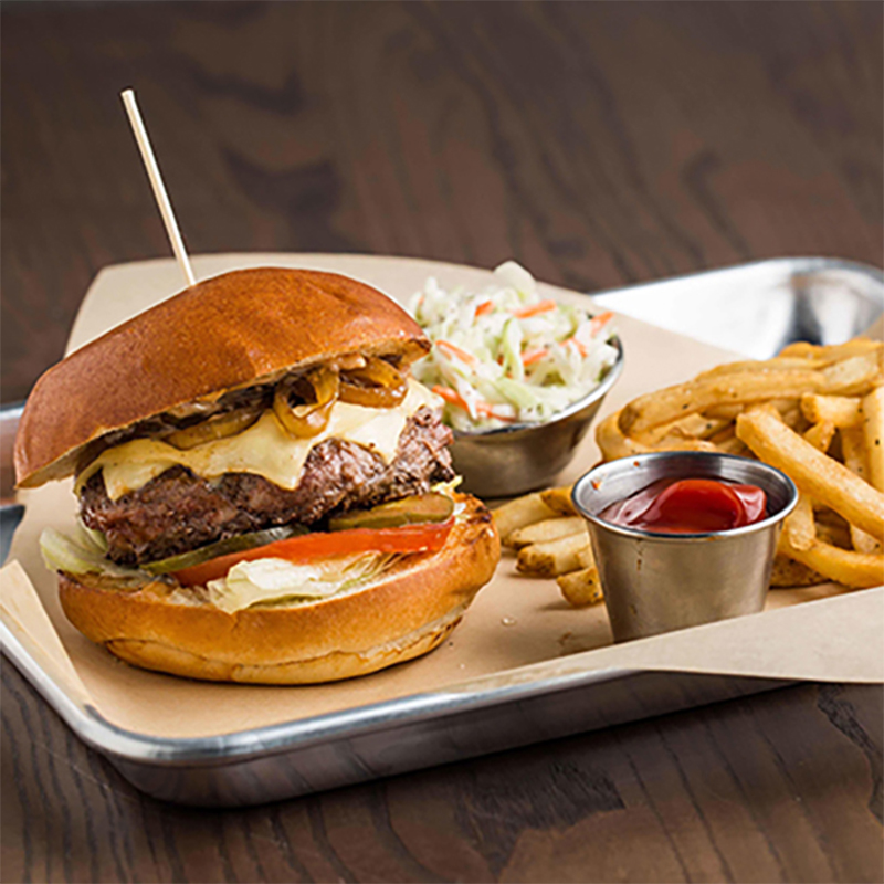 Deliciosa hamburguesa de res a la parrilla bañada con salsa cabernet demi-glacé, cubierta con queso suizo y tocino al romero. Acompañada de papas fritas y ensalada de col.