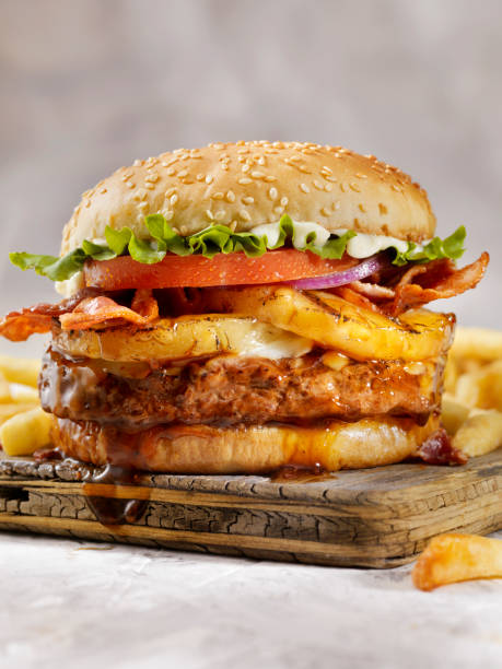 Carne de hamburguesa, jamón, queso, carne asada, salchicha, aguacate, piña y tocino.