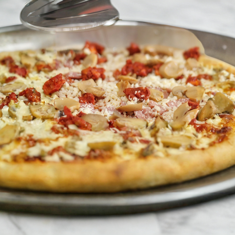 12" Pepperoni, champiñón, jamón, chorizo y queso mozzarella, 8 rebanadas.