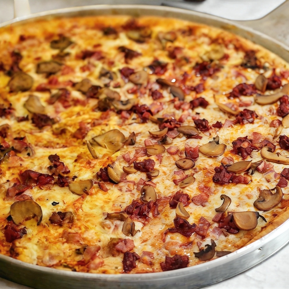14" Pepperoni, champiñón, jamón, chorizo y queso mozzarella 10 rebanadas.