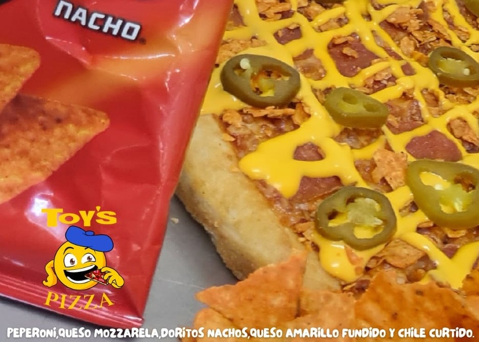 16" Pepperoni, doritos nachos, queso amarillo fundido, chiles curtidos y queso mozzarella 12 rebanadas.