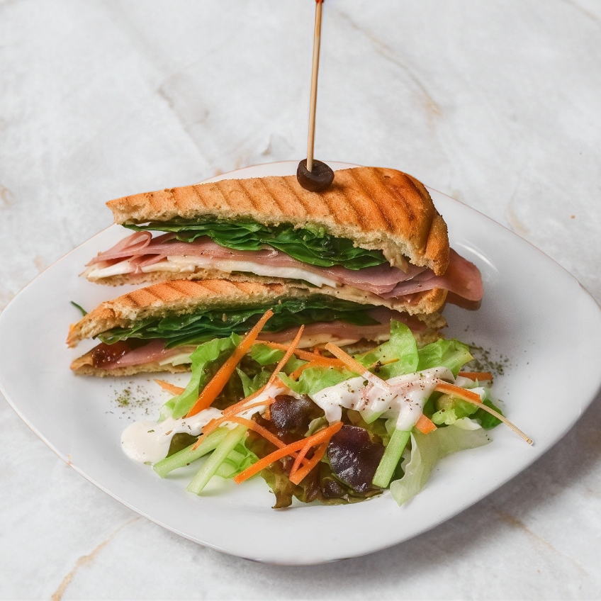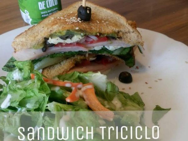 Pan integral, 3 rebanadas de jamón pechuga de pavo, queso Panela a la plancha, aceituna negra, cebolla morada, tomate y aguacate, acompañado de ensalada Triciclo y aderezos.
