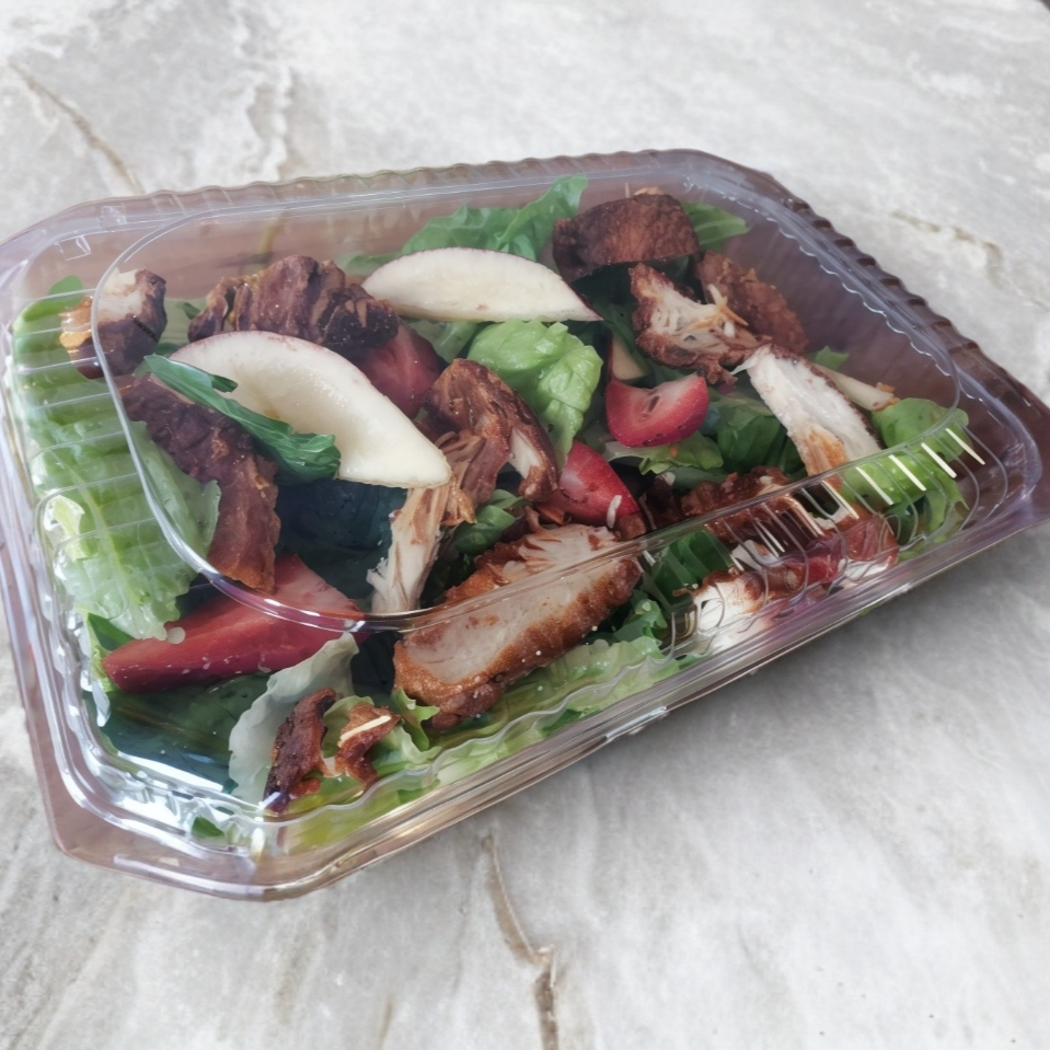 Mezcla de lechugas y espinaca, pechuga de pollo a la plancha, fresa , manzana, queso panela, nuez y vinagreta.