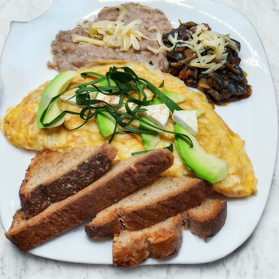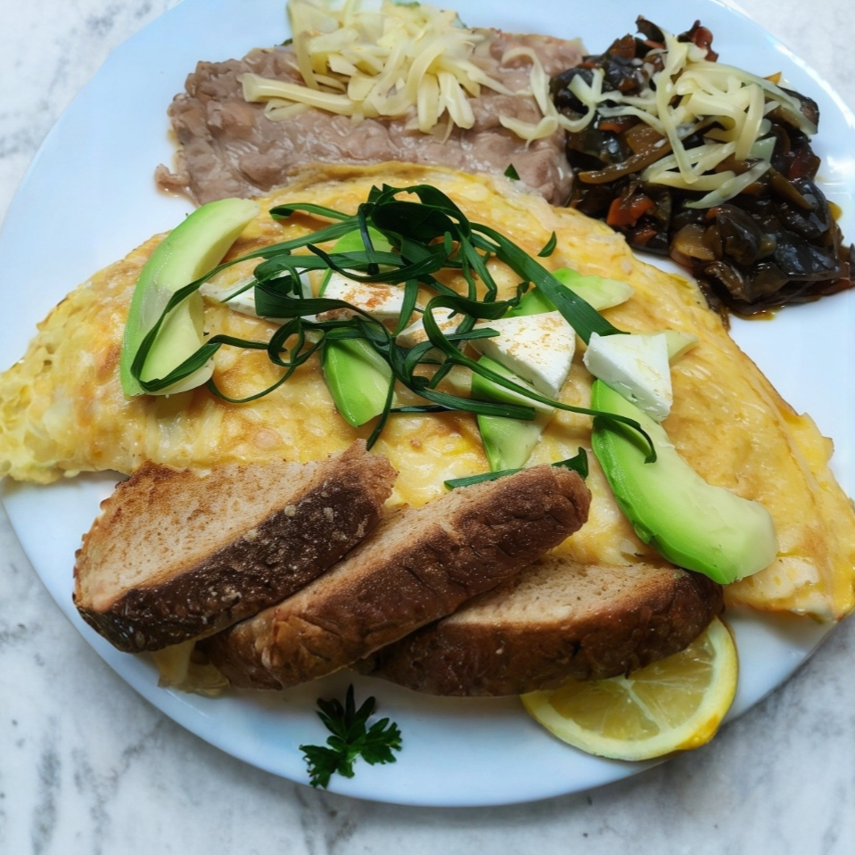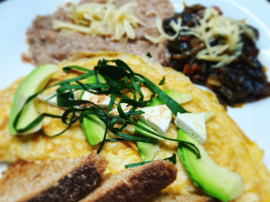 3 huevos ( o claras de huevo) hecho tortilla acompañados de guiso , frijoles refritos, rebanada de queso panela a la plancha adornado con aguacate / pan tostado o tortillas.