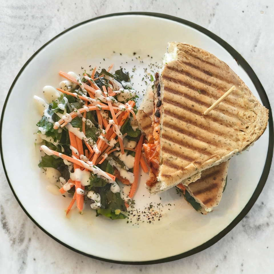 Pan panini a la hierbas finas, espinaca, 4 rebanadas pechuga de pavo, queso Panela a la plancha, aceituna negra y cebolla morada, con el toque único de mermelada de frambuesa chipotle , todo esto acompañado de señalada de la casa.