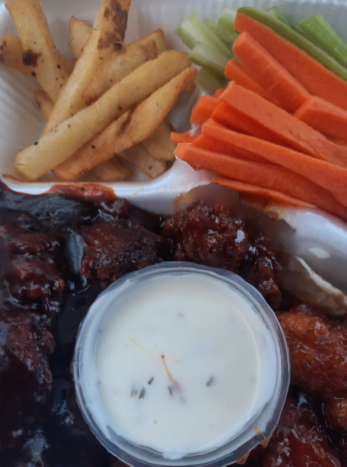 260 gr de boneless ( aprox 12 pzas) bañados en nuestra salsa barbacue , acompañados de bastones de zanahoria y apio, ranch y papás francesa.