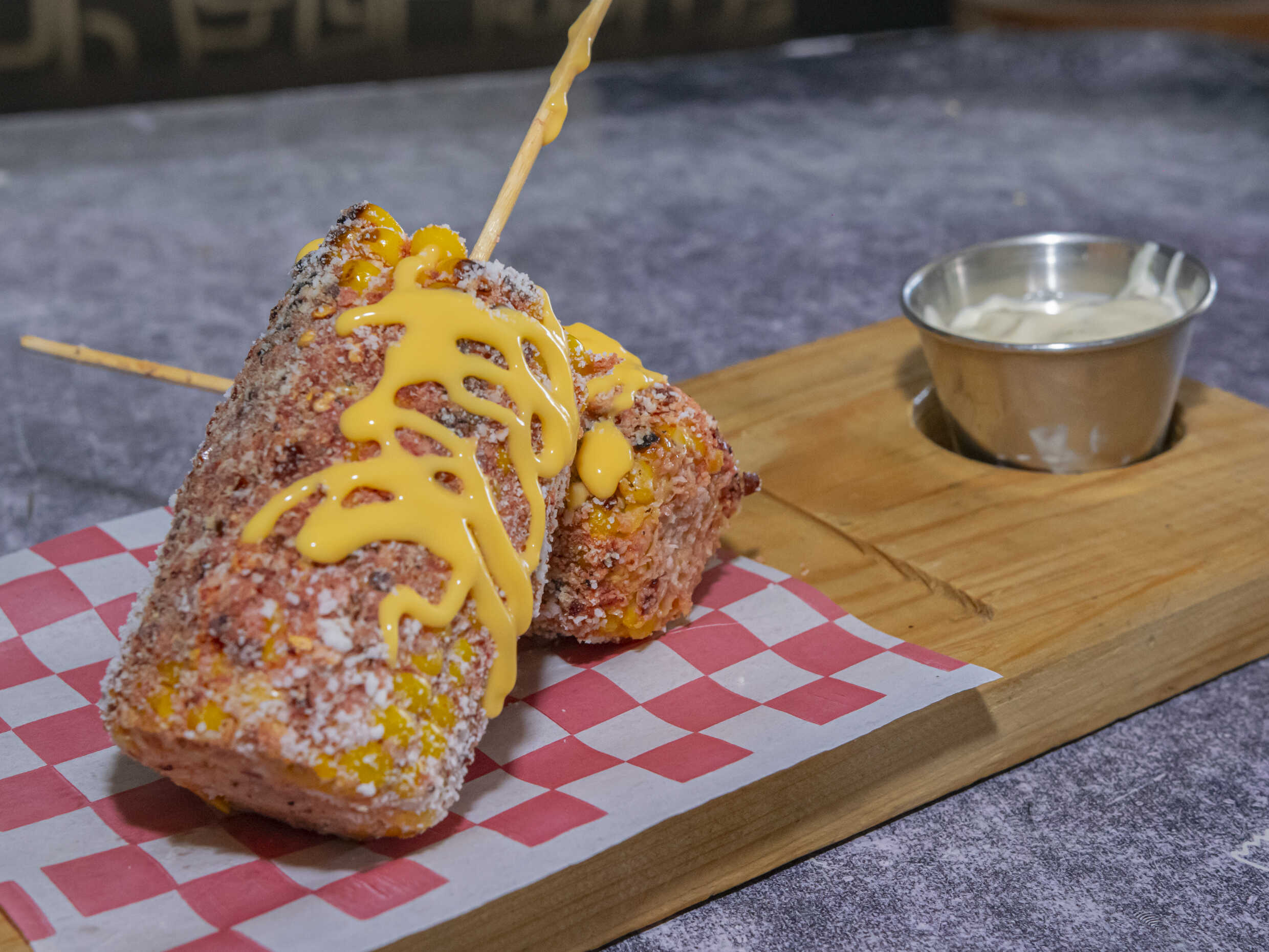 elotes toreados en mezcla de chiles bañados en queso fresco y queso amarillo