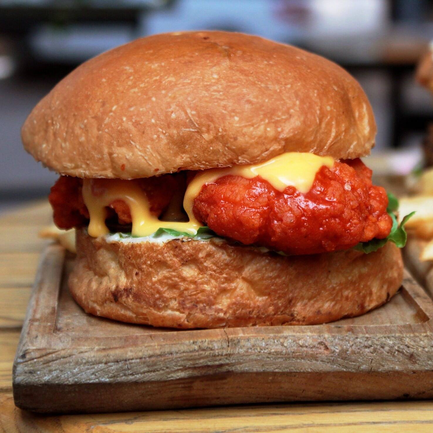 hamburguesa de boneless bañada en queso amarillo, bufalo y papas francesas