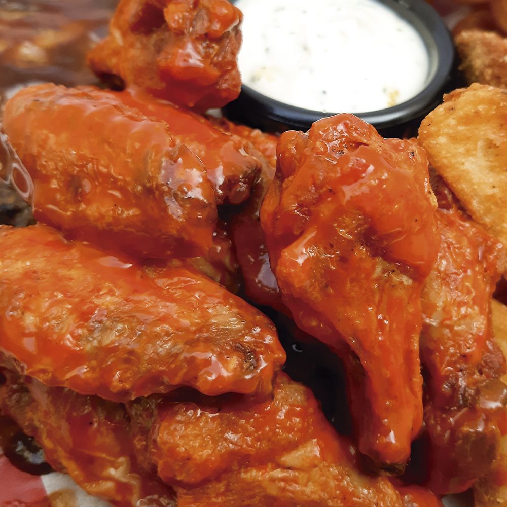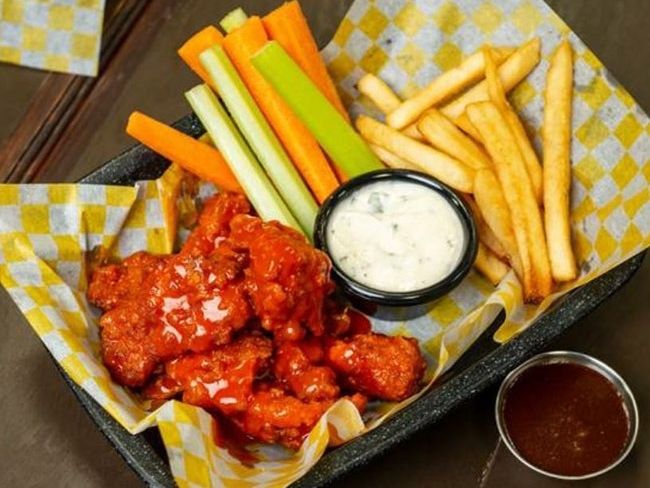 10 Piezas de alitas acompañadas de bastones de apio, zanahoria, ranch y papas a la francesa.